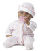 This adorable baby doll is just the right size to hug and cuddle. Gabrielle has molded plastic hair and her beautiful brown eyes open and close! She loves to be held and can also sit up "like a big girl." Her pretty frilled clothing features hearts and flowers and is removable for dressing and undressing fun, and she can suck her thumb or the included pink pacifier. Doll is 12" tall.