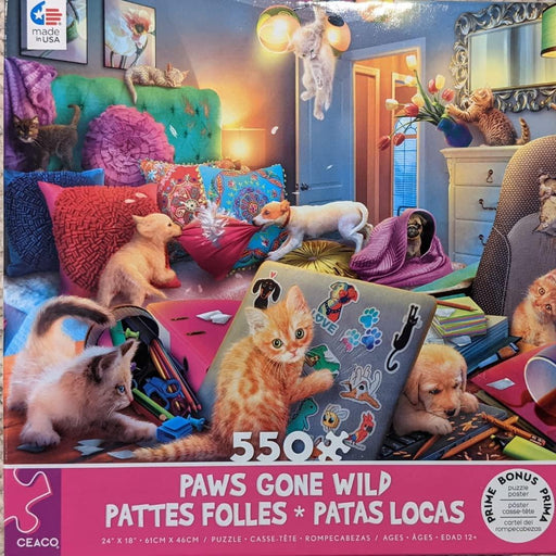 This 550 Piece puzzle depicts dogs and cats making a mess in a bedroom.