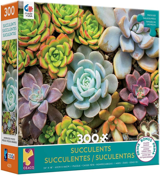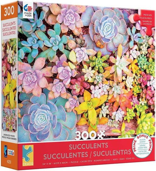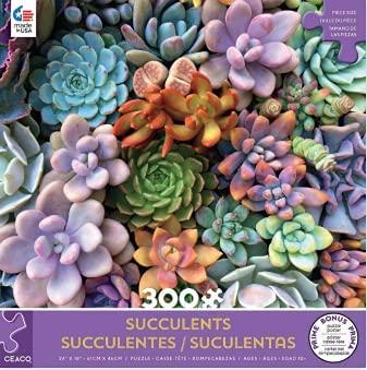 This 300 piece puzzle depicts a photo of pretty pastel succulents grouped together.