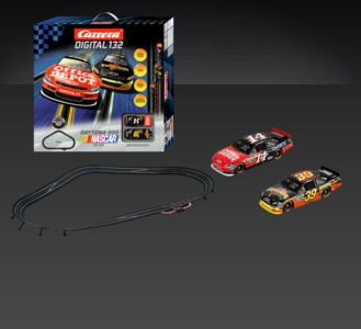 1:43 scale digital slot car set including 3 cars, a looping set, and a lane change section. Track measures approx. 8x4ft when assembled.