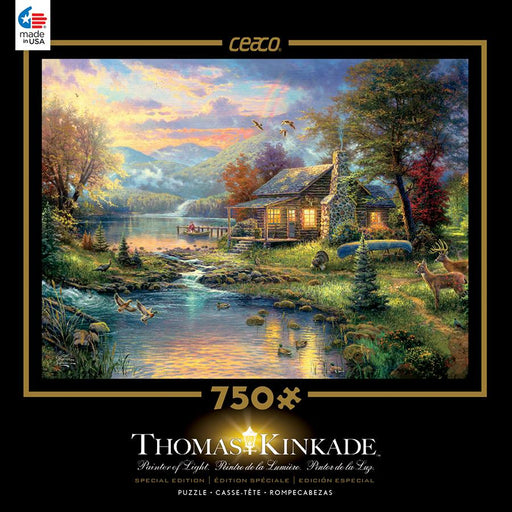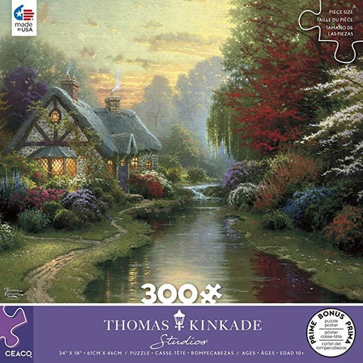 This 300 piece Thomas Kinkade puzzle shows a bright cottage beside a stream in a springtime forest scene.