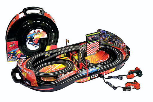 Fun On The Go! No batteries! No electricity! Completely portable slot car racing in one convenient layout! Unfold the carrying case to reveal a fu...
