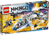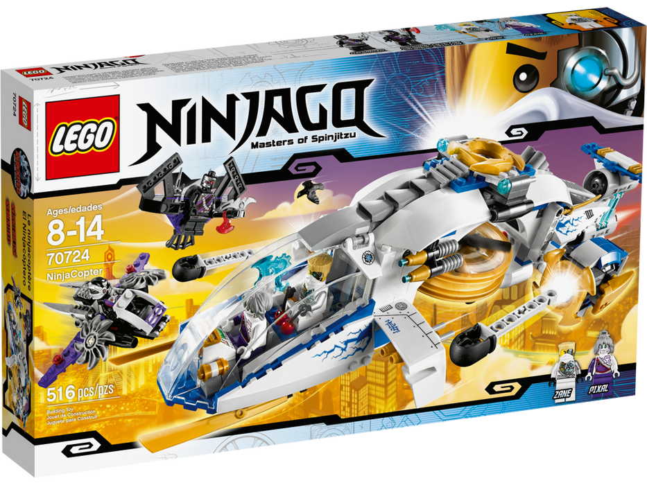 A thrilling battle is raging above New Ninjago City as the conflict for the Techno-Blades reaches new heights! Battle-scarred Zane, with his half-robot/half-Ninja face, and Pixal must work together in the NinjaCopter to outwit the attacking Nindroids. Spin the propellers and rear jet engines to soar into action. Fire the front flick missiles and rotating shooting cannons, taking care to evade the spinning saw blades of the Nindroid jet fighter. And beware – at any moment the Nindroid may launch the attack glider to double the aerial assault! Includes 4 minifigures with weapons: Zane, Pixal and 2 Nindroids.