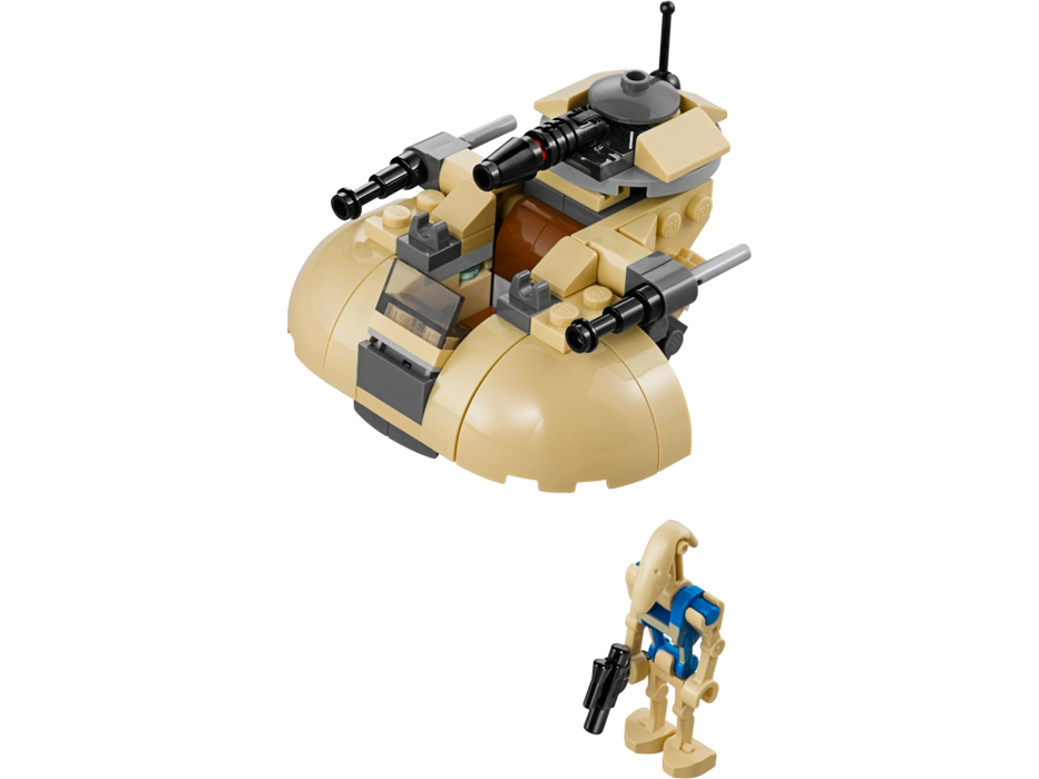 Enter a mini LEGO® Star Wars™ universe with the Droid Army AAT™ microfighter. This fun miniature model has a moving turret, 4 flick missiles and a mini cockpit for the Pilot Battle Droid™ to sit in. Prepare to battle the Clone Troopers! Includes a Pilot Battle Droid figure with a blaster pistol.