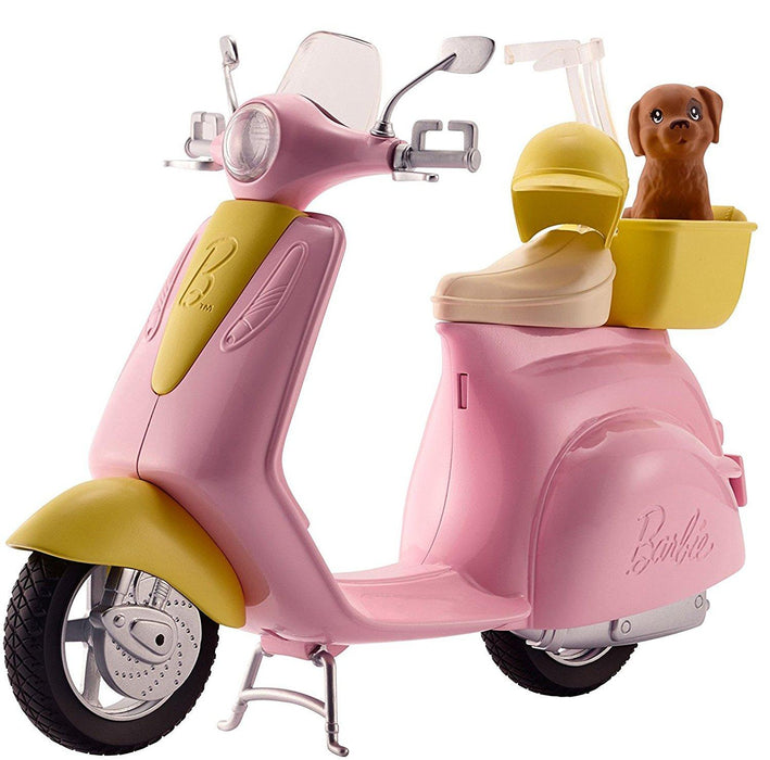 Scoot into fun with this Barbie moped. It comes with a pet friend who’s always ready to ride! Designed in pink and yellow with silvery accents, the moped is trendy and stylish. Place Barbie doll (sold separately) on the seat where a clip holds her in place. Lift up the kickstand and push to head into imagination. Bring along the puppy in the yellow basket on back. And a yellow helmet for Barbie doll lets her ride safely in style. Whether you are going for a short ride or driving into adventure, this moped is ready to roll! Includes Barbie moped with basket, puppy and helmet; doll not included. Colors and decorations may vary.