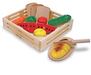 This set contains eight pieces of wooden food, a cutting board and a wooden knife. Cutting the food makes a satisfying "crunch"--and a playful introduction to concepts of "whole," "part," and fractions.
