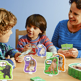 Hot dog! It’s a game of furry, four-legged fun! Draw from the stack or “go fish” from another player’s hand to collect cards that match the all of the pet necessities and accessories of the dog you want to adopt. Collect everything that dog needs and adopt it! Adopt the most dogs and you win this preschool matching game. For 2-4 players.