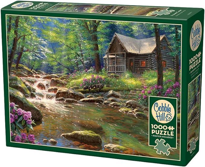 A 1000 piece puzzle depicting a cabin next to a stream.