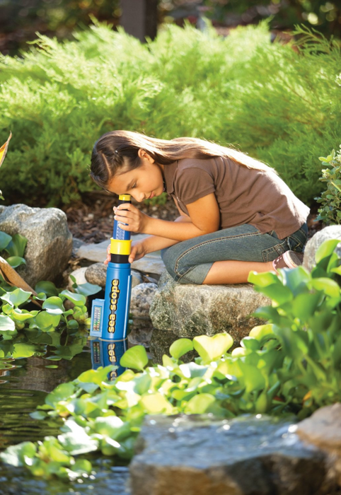 Explore on land or underwater! Great for viewing distant objects on land or exploring life in streams, ponds, lakes or tide pools!Includes 4x telescope with removable Aqualite flashlight that lights up dark underwater conditions, a built-in ruler for on-the-spot specimen measuring and a thermometer strip to determine the temperatureIncludes a removable flashlightRequires 2AA batteries (not included) Ages 6+
