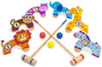 Round up the herd and grab a mallet! Little ones will have a wild time with this wooden croquet set. It comes with two mallets, three balls, and six jungle animal wickets: Lion, Monkey, Hippo, Elephant, Giraffe, and Zebra. The best part? They're customizable! Place the wickets in a line, or make a shape. Place them close, or far away. Once you're all set, use the mallet to hit the ball under each animal until you reach the end! This set comes with everything you need to teach little ones how to play this classic game. It's great for children to play solo or with a friend. The mallets measure approximately 21" tall and are ideal for little ones to play indoors or take outside. The set was made from textile and natural cuts of wood, then artfully designed with water-based safe paints.