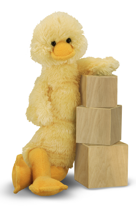 right orange, velvety bill and legs provide a dramatic visual contrast to this duck's sunny yellow body. Over twenty inches long, this duck is happy to perch on your shoulders or in your lap.