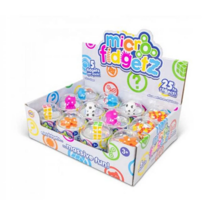 An assortment of 5 collectable micro fidget toys packaged inside a surprise container pod.