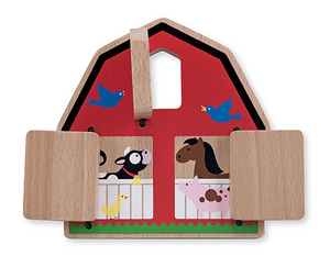 Crafted from select hardwood and accented with child-safe dyes, First Play Peek-a-Boo Barn baby toy features four friendly farm animals, hiding behind barn doors that flap open and click-clack back into place. It's ideal for young toddlers developing hand-eye coordination and concepts of object permanence. And with lots of visual detail and a peek through window in the hayloft, it will keep older toddlers busy developing vocabulary and counting skills, playing memory games and more!