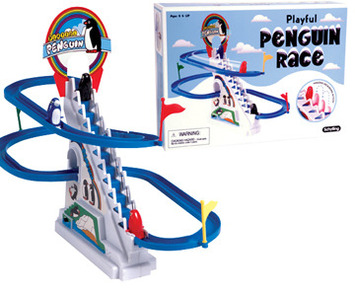 Penguins travel up the moving ladder and slide down the chute to start all over. 1-D battery required, not included. Easy assembly directions included.