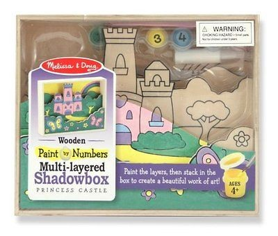 Melissa and Doug Wooden Paint by Numbers Multi Layered Shadow Box of a Princess Castle. Item # 3342. How it works is that you paint each layer and stack them on top of one another to create a shadowbox Brand new in the package. This kit comes with everything your child needs like paint,paint brush and stickers. Let your child be creative and decorate their cottage on both sides to make it their own A great gift idea for a kids of 4 years of age +. Craft projects are educational and promote self esteem and following directions.